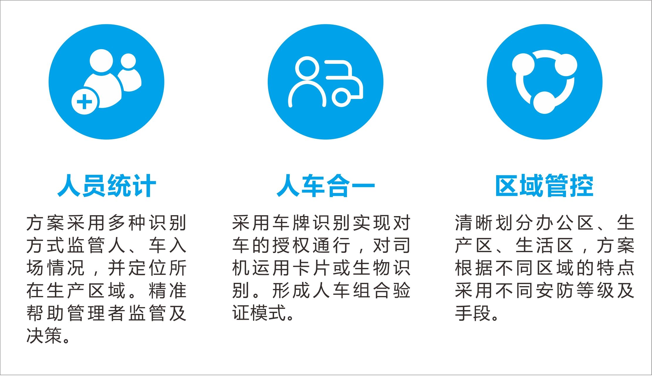 》應用目標《 關(guān)注人多難查、車(chē)雜難管問(wèn)題,采用多樣的識別手段,豐富的應用系統,實(shí)現管控手段的多樣化、數據統計的實(shí)時(shí)化、通行軌跡的可溯化。》解決方案《01/管理方式02/管理區域